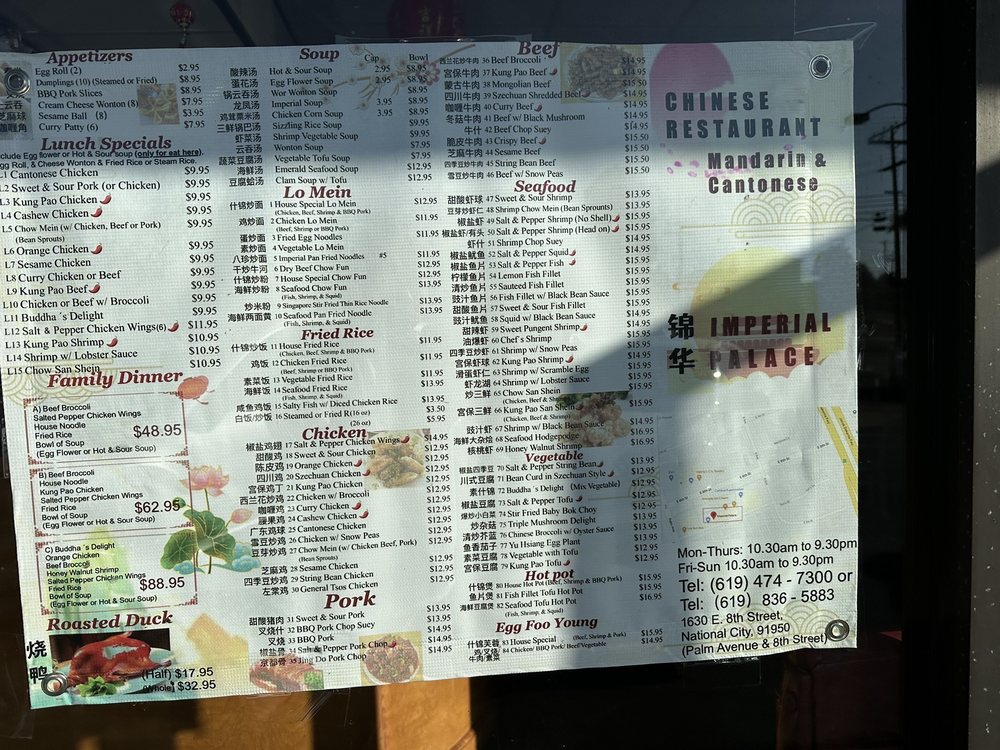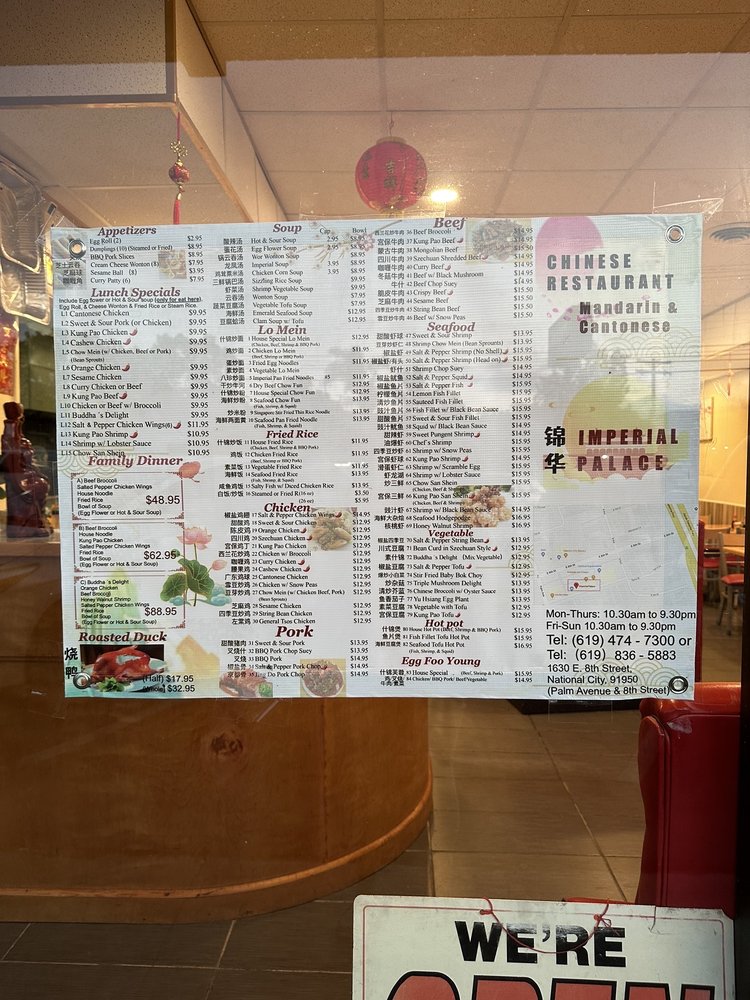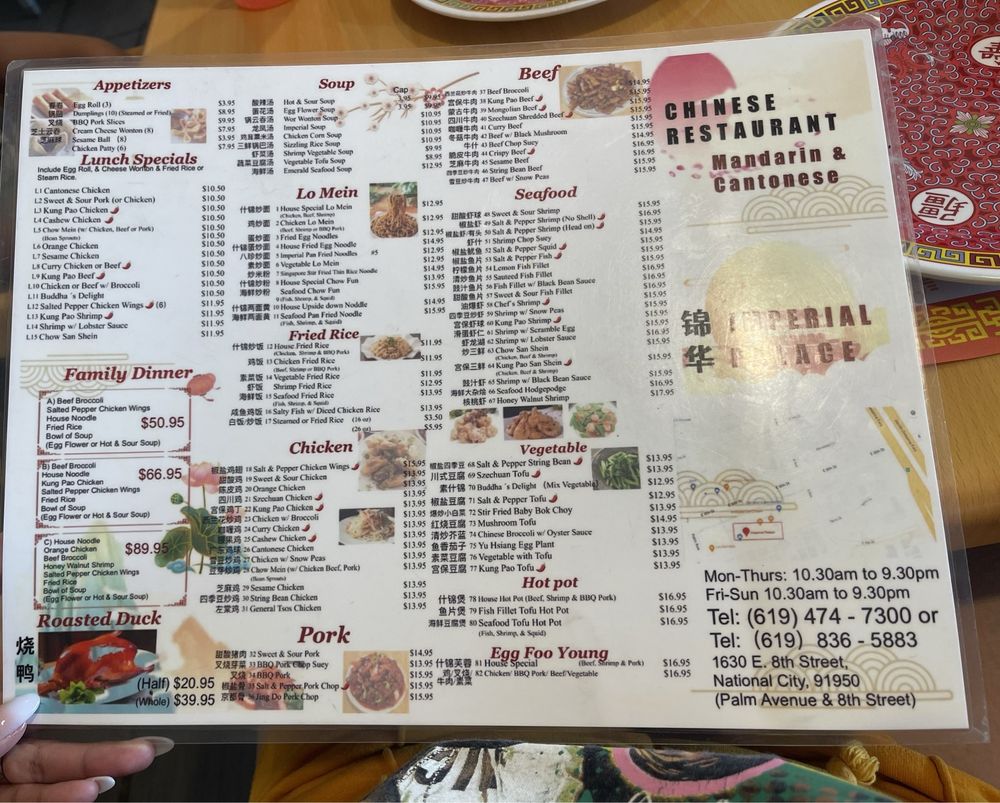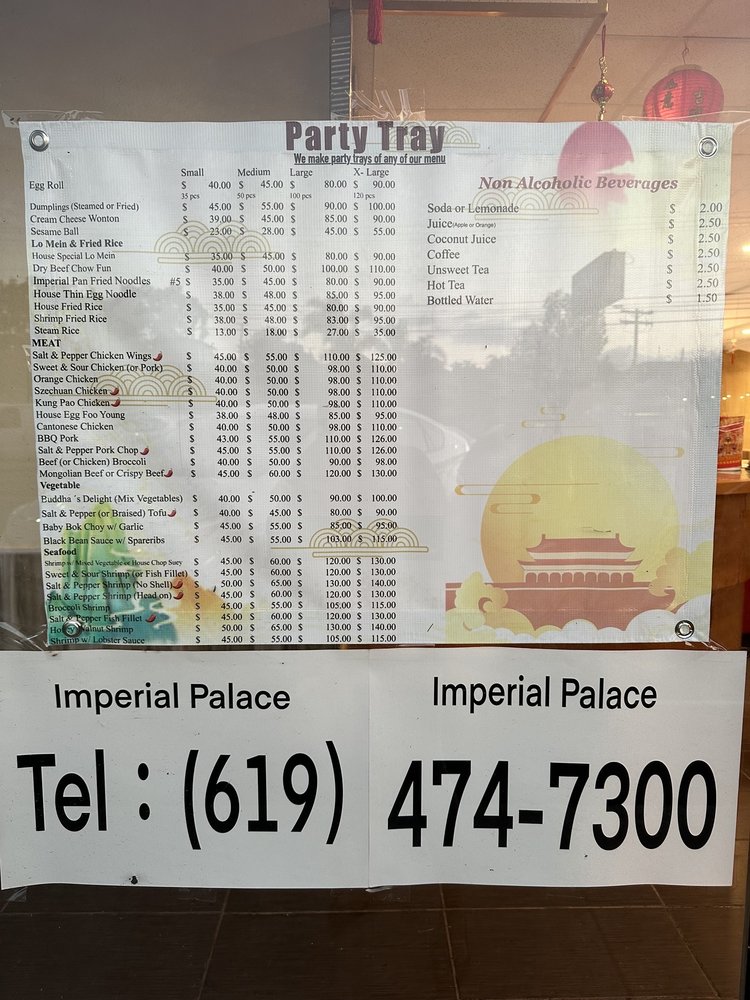 Imperial Palace, a Chinese restaurant located in National City, CA, offers a diverse menu with many vegetarian options. Customers rave about the Salt Pepper Chicken wings, which are crispy, perfectly seasoned, and generously portioned. The Beef Broccoli dish is a favorite for its tender meat and well-cooked broccoli in a delicious brown sauce. The service is top-notch, and the ambiance is cozy. The House Noodle and Mongolian Beef are also popular choices. Overall, Imperial Palace impresses with its flavorful dishes, efficient service, and generous portions. If you're looking for a satisfying Chinese meal, Imperial Palace is a go-to spot.